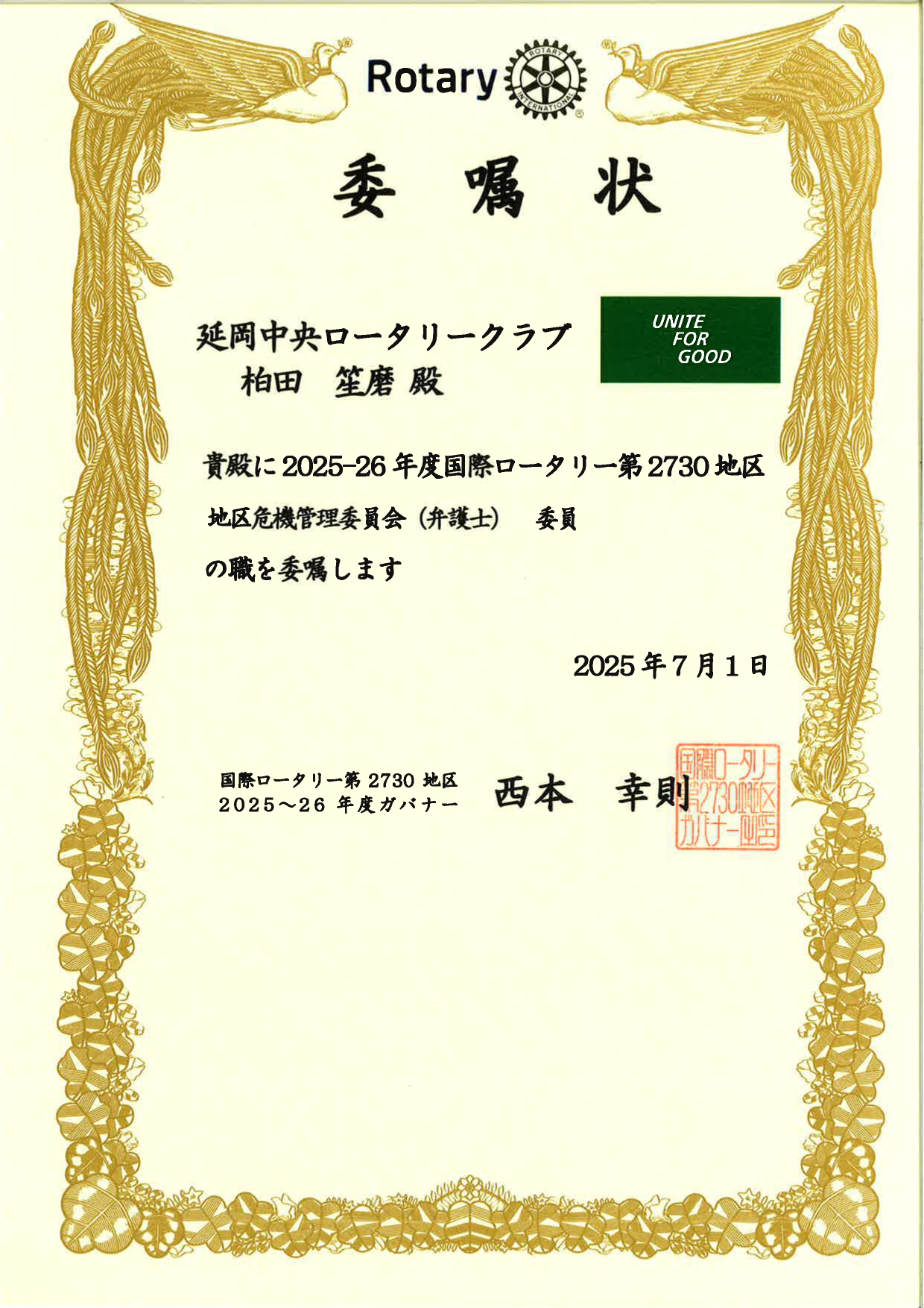 - 【ご報告】代表弁護士柏田笙磨が国際ロータリー第2730地区の危機管理委員(弁護士)に選任されました